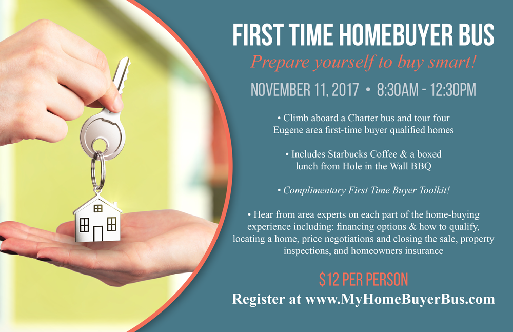 Prepare yourself to buy smart by attending Marcia’s First Time Buyer Bus Tour from 8:30 a.m. to 12:30 p.m. on Nov. 11. Your registration will include a tour of four Eugene and Springfield area homes at first-time buyer price points ($225-324K), a first-time buyer toolkit, a boxed lunch from Hole in the Wall BBQ, and presentations by leading area experts on home-buying, financing options, locating a home, price negotiations, property inspections and more. Tickets are only $12 per person and may be purchased at www.myhomebuyerbus.com. Sign up to reserve your seat today!